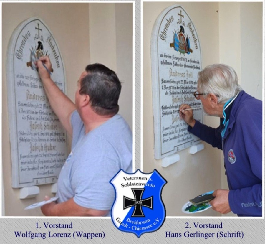 Das war Teamwork der besonderen Art. Auf Initiative unseres 1. Vorstands Wolfgang Lorenz haben wir uns während seiner Urlaubszeit ans Werk gemacht und die Gedenktafel renoviert, sodass die Farben und Schriften wieder in neuem Glanz erstrahlen.