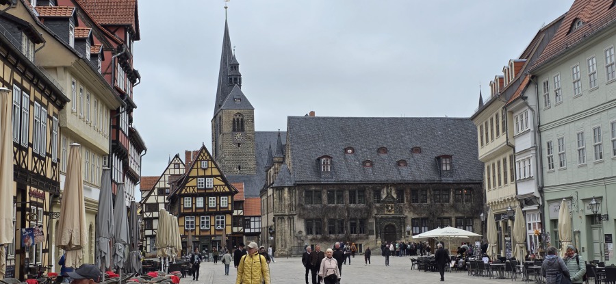 Anschließend wurde die Stadt Quedlinburg besichtigt. Die UNESCO erklärte 1994 die Stiftskirche, das Schloss und die Altstadt zum Weltkulturerbe. Zunächst hatten wir Zeit zur freien Verfügung, um uns die Sehenswürdigkeiten von Quedlinburg, insbesondere die historische Altstadt mir dem Rathaus sowie auch auf dem Schlossberg die Stiftskirche St. Servatius mit Schloss, anzusehen. Den Abschluss und das Highlight war die Stadtrundfahrt mit der Bimmelbahn quer durch Quedlinburg, wobei wir tiefergehende Informationen zu den über 2.100 Fachwerkhäusern erhielten.